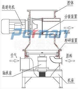 ※ 機體內腔為園筒形,上部份為超微分級機,下部分為超微粉碎機。粉碎室由粉碎盤和磨塊組成,用來將物料擊碎成細粉,分級室由分級葉輪組成,能把細粉分成粒度達標品和未達標品兩種規格,達標品經出料管排出,由旋風集料器收集。未達標品沿腔體內壁回落到粉碎室,繼續粉碎直到達標為止。