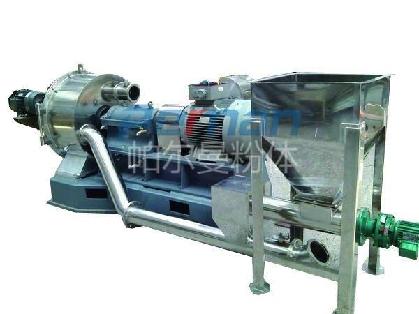 物料由加料系統(tǒng)均勻的送入粉碎室受到高速旋轉(zhuǎn)的粉碎盤(pán)的強(qiáng)烈沖擊,同時(shí)受到離心力的作用,與粉碎齒圈發(fā)生碰撞,受到剪切、摩擦、碰撞等多種綜合力的作用,使物料粉碎,被粉碎的物料隨氣流運(yùn)動(dòng)到分級(jí)區(qū),通過(guò)變頻調(diào)節(jié)的分級(jí)輪,對(duì)粗細(xì)物料進(jìn)行分離,符合細(xì)度要求的產(chǎn)品隨氣流進(jìn)入旋風(fēng)收集器和除塵器收集,粗物料返回分級(jí)區(qū)二次粉碎。