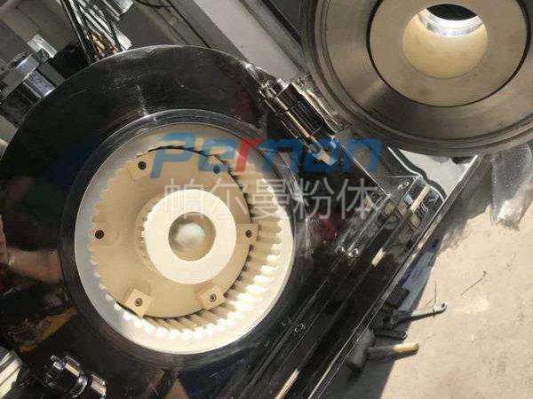 CAM-S雙軸陶瓷粉碎機工作運轉(zhuǎn)中物料由加料系統(tǒng)均勻的送入粉碎室受到高速旋轉(zhuǎn)的粉碎盤的強烈沖擊,同時受到離心力的作用,與粉碎齒圈發(fā)生碰撞,受到剪切、摩擦、碰撞等多種綜合力的作用,使物料粉碎,被粉碎的物料隨氣流運動到分級區(qū),通過變頻調(diào)節(jié)的分級輪,對粗細(xì)物料進行分離,符合細(xì)度要求的產(chǎn)品隨氣流進入旋風(fēng)收集器和除塵器收集,粗物料返回分級區(qū)二次粉碎。